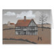 Colourful artwork of an old medieval house in the English countryside, with an old church in the background, and a couple of hares boxing in the foreground. Perfect for anyone who loves folk art.