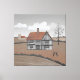 Colourful artwork of an old medieval house in the English countryside, with an old church in the background, and a couple of hares boxing in the foreground. Perfect for anyone who loves folk art.