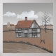 Colourful artwork of an old medieval house in the English countryside, with an old church in the background, and a couple of hares boxing in the foreground. Perfect for anyone who loves folk art.