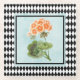 Hübsche Geranium-botanische Darstellung auf belastetem hellen Denim-Hintergrund mit schwarz-weißem Harlequin-Musterrahmen.