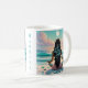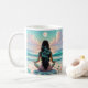 Schöne Ai-Kunst, die eine wunderschöne Frau darstellt, die am Strand meditiert, mit Pina und blauen Wolken, Ozeanwellen, weißem Sand und Meerglas.