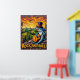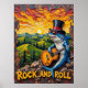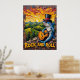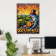 Dieses fantasievolle Gemälde zeigt einen Hai, der mit einem Hut und coolen Sonnenbrillen geschmückt ist und eine "Sonnenuntergangssymphonie" auf einer elektrischen Gitarre von einem felsigen Gipfel auslöst. Die Szene entfaltet sich über sanfte, grüne Hügel und Bäume, die im warmen, strukturierten Licht einer untergehenden Sonne baden. Das lebendige, impasto Bürstenwerk schafft eine kraftvolle und skurrile Atmosphäre und feiert den "ROCK and ROLL" Geist in einer einzigartigen natürlichen Umgebung.