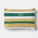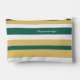Three-color design with harmonious stripes. Horizontal lines in three colors for your accessory pouch. Add your name or text on front and back. This variant is the festive color scheme in green, gold, and white.