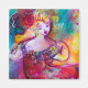 Farbenfrohe, künstlerisch-skurrile, abstrakte figurative zeitgenössische Aquarellmalerei mit drei Spielerfiguren, blumengeschmückten Wirbel, Rose, Blume, vergoldeten Glitzern, Silberfolie in lebhaften Gelb-, Rot-, Blau-, Rosa Fuchsienfarben .