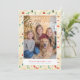 This cheerful, vertically-oriented holiday card showcases a warm family photograph centered within a unique, illustrated border. The background pattern combines classic seasonal motifs like holly and evergreen trees with enchanting elements from the Wizarding World, including wands, golden snitches, and flying letters. The photograph, which beautifully captures three smiling children and their dog in front of a glowing Christmas tree, is elegantly inscribed with the words "HOLIDAY Greetings." The bottom section of the card is personalized with the family name and the year, offering a magical and sweet way to share best wishes for the holidays.