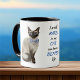 Hier ist die perfekte Latte-Tasse für den Siamer Katzenbesitzer! Auf jeder Seite ist ein Portrait einer blauen mit Augen Siamkatze mit Brille und einer blauen Bogen-Krawatte. Zwischen den Bildern ist schwarz-blau Text, der sagt: "Ich arbeite HARD, damit meine CAT ein besseres Leben haben kann". Niedlich!