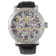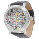 Diese männliche Uhr hat ein modernes Design von einem Gitter aus schwarzen Linien mit Quadraten und Rechtecken in Retrofarben auf einem Feld von weiß.