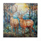 Diese Keramik Kachel hat ein Bild von zwei wunderschönen verstreuten Hirschen, stehend in einem Wald mit Licht auf die Berge hinter ihnen. Die vorherrschenden Farben sind Blau, Gold, Braun und Grün. Ein farbiges Glas mit Overlay verleiht dem Design noch mehr Interesse.