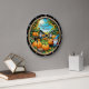 This round wall clock features an enchanting autumn scene with gnomes harvesting pumpkins in a sunflower field under a bright sky. Pumpkins of various sizes and rustic crates fill the vibrant green landscape. The text "Harvest Blessings" is prominently displayed, making it a charming addition to any fall decor.