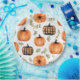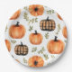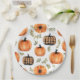 Ernte Harmony Paper Plate Ein bezauberndes Herbsttableau mit einem Kürbismedley in warmen Erdtönen. Das Design verbindet klassische Orangenköpfe mit karierten Klangmustern, eingebettet in zartes Grün und Braun. In sanften Aquarellfarben verwandelt, erinnert die Komposition an den gemütlichen Herbstgeist, der perfekt für die Feier der natürlichen Schönheit und des festlichen Ambientes der Saison ist.