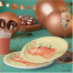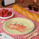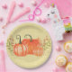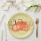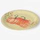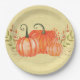 Hübsche Herbstthematische Teller bieten ein Trio von Aquarellkürbissen mit Zweigen von Herbstlauben auf hellen Einbrüchen.