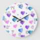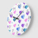 Magst du Uhren mit Herzen auf ihnen? Diese Uhr hat ein Herz-Aquarell-Muster in Rosa, Blau und lila gemacht. Es hat auch Zahlen.