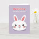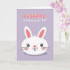 Diese Karte zeigt einen stilisierten weißen Hasenkopf, der im unteren Teil des Designs ruht und vor einem sanften Lavendel-Hintergrund platziert ist 🌷. Der Hase hat aufrechte Ohren mit rosa Innenflächen, kleine schwarze Augen, eine winzige rosa Nase und runde rosige Wangen, die ihm ein zartes, freundliches Aussehen verleihen, als ob er sich für ein süßes Hallo vorbeugt. Direkt über dem Hasen befindet sich eine zweizeilige Nachricht im oberen Teil, wobei die erste Zeile in korallenroter Schrift und die zweite Zeile in weißer Schrift für einen sanften Kontrast gehalten ist. Die abgerundeten Buchstabenformen fühlen sich weich und liebevoll an, sie spiegeln den ruhigen Ausdruck des Hasen wider und verleihen einen gemütlichen, vertraulichen Ton 🐰. Feine Schnurrhaare und ein kleiner gebogener Mund fügen einen Hauch von Wärme hinzu, als ob der Hase still vor sich hin lächelt, jemand Besonderem zugewandt. Ein schwacher Schatten unter dem Hasenk