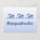 #aquaholic. Kann man nicht genug vom Pool bekommen? Dann ist das die Postkarte für Sie - und für alle, die wirklich Lieben schwimmen. Der Text ist blau, mit drei blauen Piktogramm-Schwimmern oben, auf einem blass blauen Farbverlauf Hintergrund.
