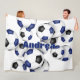 Dieser Fun-Fußball-Fleecedecke kann mit dem Namen des Athleten personalisiert werden, auf dem ein Haufen übergroßer blauer, schwarzer und weißer Fußballbälle - von katz_d_zynes
