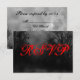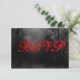 A custom response RSVP card template with grungy letters on a spooky Halloween sky with misty trees along a dark haunted road, gothic ravens and a cloudy full moon in black and white. Click Customize It to change fonts, sizing and more, even save your design for later.