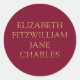 Aufkleber mit den Vornamen der Hauptfiguren von Pride und Prejudice von Jane Austen: Elizabeth, Fitzwilliam, Jane, Charles in Imitaten Gold vor rötlichem lila Hintergrund. Ideal für Buchliebhaber und Fans von Jane Austen.