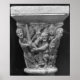 Die Hauptstadt einer Säule (Stein) der Französischen Schule an der Kirche von Saint-Nectaire, Frankreich. Die Hauptstadt einer Säule entstand um das 12. Jahrhundert.