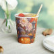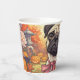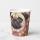 Die Mops Party Papier Cups mit Mops der Hund im Herbst farbigen botanischen Garten für Halloween vorbereitet. Schönes Jugendstil-Kunstwerk für das Haus des Mops mit Kürbissen, Hexenhut, Fledermäusen und einzigartigen großen Blume-Blüten.