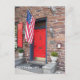 Rote Eingangstür mit amerikanischer Flagge für ein Haus im Kolonialstil in Gettysburg Pennsylvania
