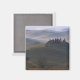 Souvenir Foto Magnet eines Bauernhauses in der Nebelmorgendlichen am Rand der Morgendämmerung in der Toskana zwischen den sanften Hügeln des Val d’Orcia zwischen Pienza und San Quirico d’Orcia in Italien.