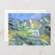 Häuser in der Provence. Paul Cezanne. Schöne Landschaft in warmen Farben. Ein großes gelbes Haus mit einem roten Ziegeldach. Bäume wachsen in der Nähe des Hauses. Blauer Himmel mit Wolken. Reproduktion berühmter Kunstbilder im öffentlichen Bereich.
