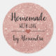 Moderner Aufkleber "hausgemacht mit Liebe" mit schwarzem Schriftart auf einer Rose goldenem Glitzer, der durch ein niedliches rotes Herz geschmückt ist. Text anpassen.