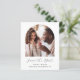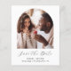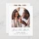 Diese schlichte, minimalistische Save the Date Karte verfügt über einen Boho-Foto-Bogen über den Worten "Save the Date" in eleganter schwarzer Schrift, gefolgt von den Namen der Ehepaare, Hochzeitstag und Stadt in serifenlosen Sans-Schriftart auf weißem Hintergrund. Fügen Sie ein zweites, horizontales Foto und eine ausführlichere Nachricht mit zusätzlichen Informationen auf der Rückseite hinzu.