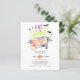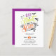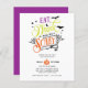 Mit den Worten "Essen, Trinken und Beängstigend sein" in einem lila, orangefarbenen, limatengrünen Stil und Retro-Typografie-Stil und mit Fledermäusen, Mond, Netzen und einer kleinen Spinne über weißem Hintergrund sind diese Halloween-Party-Einladungen perfekt, um Ihre Freunde und Familie einzuladen! Personalisieren Sie Ihre Halloween-Party-Details in weißer Schrift auf schwarzem Hintergrund. Farben sind veränderbar!