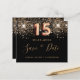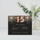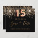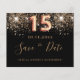 Eine junge und trendige Save the Date für eine Quinceañera, 15. Geburtstagsfeier. Ein schwarzer Hintergrund mit goldenem Imitat-Glitzer. Vorlagen für Datum, Namen und Text. Goldene Buchstaben. Der Text: Save the Date ist mit einem großen angesagten, handgeschriebenen Stilskript geschrieben.