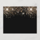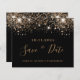 Eine gmädchenhafte und trendige Save the Date-Karte für eine Quinceañera, 15. Geburtstagsfeier. Ein schwarzer Hintergrund mit goldenem Imitat-Glitzer. Vorlagen für Datum, Namen und Text. Goldene Buchstaben. Der Text: Save the Date ist mit einem großen angesagten, handgeschriebenen Stilskript geschrieben.