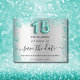 Eine gmädchenhafte und trendige Save the Date-Karte für eine Quinceañera, 15. Geburtstagsfeier. Ein Imitat silber aussehender Hintergrund mit aquamarinen, grünen Imitaten Glitzer Staub. Personalisieren und fügen Sie Datum und Name/Alter hinzu. Der Text: Save the Date ist mit einem großen angesagten, handgeschriebenen Stilskript geschrieben. Nummer 15 mit einem Schriftart im Ballonstil.