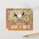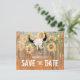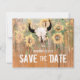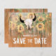Die rustikale Hochzeitssonnenblumen Ankündigung Datum freihalten eine Flachkarte. Western Rodeo Bull Schädel mit Hörnern Land Blumenstruktur. Stallholz Vintag braun, gelb grün. Bauernhaus Cowboy Design. Bildrecht Marg Seregelyi Fotografie.