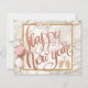 Ein Preis SMALLER 4,5" x 5,6" Alternative in einem SEMI-GLOSS 110 lb CARD STOCK, ähnlich der Dicke einer Postkarte. Die Umschläge sind etwas größer als die Kartengröße. Happy Neujahr Script Champagne Balloons. Senden Sie funkelnd Grüße mit Happy New Year in der Mitte Bühne in einer eleganten Rose Goldskripttypografie in einem goldenen Imitat glitschig Grenze und Gold Konfetti und wirl gemusterte Grenze an einem Elfenbeinrahmen. Champagner, Ballons, Maske und Hintergrunduhrturm runden das Design ab. Auf der Rückseite ist ein koordinierendes Muster, das Sie mit Ihrem Gruß, Ihren Namen und dem Jahr leicht personalisieren können.