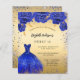 Eine moderne, stilvolle und glamouröse Einladung zu einer Sweet 16. Geburtstagsfeier. Ein goldenes Imitat mit Imitat blauen Glitzern und einem königsblauen Kleid und Rose, Blumen. Der Name ist mit einem modernen handgeschriebenen Stilskript geschrieben. Personalisieren Sie Ihre Party-Daten und fügen Sie sie hinzu. 1 Blatt = 1 Einladung mit Druckkante bis Kante.
