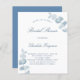 Ein weißer Hintergrund, mit dustigen blauen Eukalyptus-Stielen dekoriert, mit Sprigs. Personalisieren und fügen Sie einen Namen und Party-Details hinzu. Zurück: staubiger blauer Hintergrund.