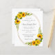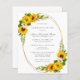 Die elegante Feier einer Lebenseinladung umfasst zwei gelbe Sonnenblumen und weiße, dunkle Blumenarrangements, die einen goldenen Rahmen schmücken. Der Name des Verstorbenen wird in einem traditionellen Skripttext geschrieben. Der gesamte Text kann leicht bearbeitet werden, um eine persönliche Erinnerung zu schaffen.