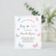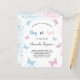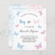 Für ein Geschlecht zeigen Babydusche. Ein schick weißer Hintergrund. Dekoriert mit rosa und blauen Schmetterlingen und Glitzer Staub Personalisieren und fügen Sie den Namen der Mutter zu sein und Party Details. Der Name und der Text: Junge oder Mädchen werden mit einem handgeschriebenen Stift geschrieben