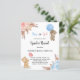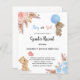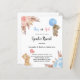 Für eine moderne Babydusche im bohobischen Stil, zeigen die Geschlechter das Party. Ein weißer Hintergrund. Mit Rose Gold, rosa und hellblauen Blumen, Rose, Pampas Gras und zwei Teddybären mit Ballons dekoriert. Personalisieren und fügen Sie die Namen und Party-Details.