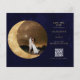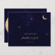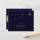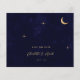 Eine minimalistische, moderne himmlische Hochzeitseinladung zeichnet sich durch ein schlichtes und elegantes Design aus. Es beinhaltet einen vergoldeten Mondfilm und Sterne, die sanft glitzern, Set vor einem Mitternachtsblauen Hintergrund. Die Einladung benutzt klassische Serifentypografie, die eine traditionelle und formale Touch mit ihrem gepflegten und klaren Stil hinzufügt.