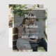 Eine moderne und trendige All-in-One-Foto-Hochzeitseinladung, die Ihre Hochzeitsinformationen über einem Ihrer Lieblingsfotos zeigt, mit einem schwarz-transparenten Overlay und einem eleganten, weißen Script, aber mit einem Blick auf das Budget. Einfach mit den Details Ihrer Hochzeitsfeier in Weiß anpassbar für ein romantisches, modernes und stilvolles Ambiente. Die Rückseite der Karte zeigt ein zweites Bild, Ihre Online-UAWG und das Fälligkeitsdatum, einen individuell anpassbaren QR-Code, um Ihre Gäste auf Ihre Hochzeitswebsite, Ihre Monogramme und Ihr Hochzeitsdatum zu leiten.