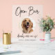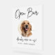 Niedliches editierbares Begleitheitssignaturzeichen mit einem Umkreis, um das Bild Ihres Haustieres zusammen mit Kalligrafie Schriftart Open Bar, Getränke sind auf uns! Personalisieren Sie die Namen der Braut und des Bräutigams sowie den Namen des Begleiters.