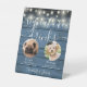 Mit hübschen Saitenlichtern auf blauem, rustikalem Holzfußboden ist dieses elegante, für Ihre Hochzeitsfeier passende Getränkedosenschild. Entwickelt von Thisisnotme©