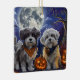 Entfesseln Sie den unheimlichen Geist mit diesem unheimlichen Halloween-Design, das eine Hundepackung unter einem dunklen, mondbeleuchteten Himmel bietet, umgeben von fliegenden Fledermäusen und glühenden Kürbissen. Ideal für diejenigen, die mit ihren wütenden Freunden eine Touch voller Furcht Liebe haben!