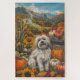 Feiern Sie die Schönheit des Herbstes mit diesem lebendigen Gemälde eines Hundes, der neben einer reichen Erntedank-Ernte sitzt. Die reichen Herbstfarben von Kürbissen, Sonnenblumen und die rustikale Landschaft der Bauernhäuser schaffen eine warme und einladende Atmosphäre, die sich perfekt für jeden Hundefreund im saisonalen Dekor eignet.
