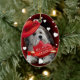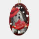 Entzückender Havanese Welpe, der roten Feiertagshut gegen hinteren Tropfen der weißen Herzen trägt, holt eine Mitteilung der Liebe und macht eine Spaßdekoration für den Weihnachtsbaum.
