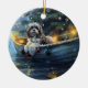 Set segelt mit dieser sehr detaillierten Abbildung in den Zauber der Urlaubssaison und zeigt einen stolzen Hund, der in einem festlich dekorierten Boot sitzt und über einen ruhigen Weihnachtssee gleitet. Die Lichter der nahen Kiefernbäume reflektieren das Wasser und warmen, festlichen Glanz, der das gemütliche Ambiente verstärkt. Die Ornamente versetzen sich von den Seiten des Bootes, während die Laternen leuchten und eine Szene schaffen, die das wahre Wesen der Weihnachtswärme und -freude einfängt. Dieses nostalgische Kunstwerk bringt eine Touch von Urlaubsmagie in jeden Raum, perfekt für diejenigen, die den Geist der Saison schätzen.