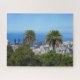 Puzzle. Ein Panoramablick auf Honolulu Hawaii ist von einem Hügel aus erobert, mit zwei prominenten Palmen im Vordergrund, die die urbane Szene umrahmen. Der klare blaue Himmel und der Horizont des fernen Ozeans bilden eine ruhige Kulisse zur geschäftigen Stadt unten.
