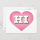 Diese Postkarte zeigt ein ruhiges, cooles und eingefangen rosa Herz mit einem weiß gekalkten Zentrum, das die fett-weiß-Groß-Buchstaben HI enthält, die offizielle Abkürzung für Hawaii, den Aloha-Staat. Die Rückseite der Postkarte ist leer und wartet auf Ihre handgeschriebenen Stimmungen oder Ihren personalisierten Text.