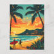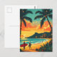 Eine festliche Postkarte mit einem tropischen Hawaii Weihnachten mit Surfern in Weihnachtsmannmützen, Palmen und einer goldenen Sonnenuntergang Strand-Szene. Eine lustige und einzigartige Urlaubskarte.